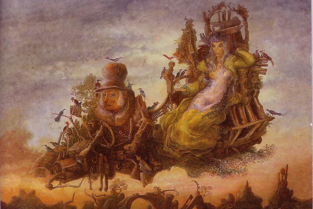 L’homme l’emmena très loin en ramant de ses rames de cuivre qui, humides, scintillaient dans l’air. Ils arrivèrent à un village: à l’entrée se trouvait une grande maison et derrière celle-ci, une autre plus petite. L’homme dit d’une voix sévère: "Rentre dans la grande maison, mais jamais dans la petite."